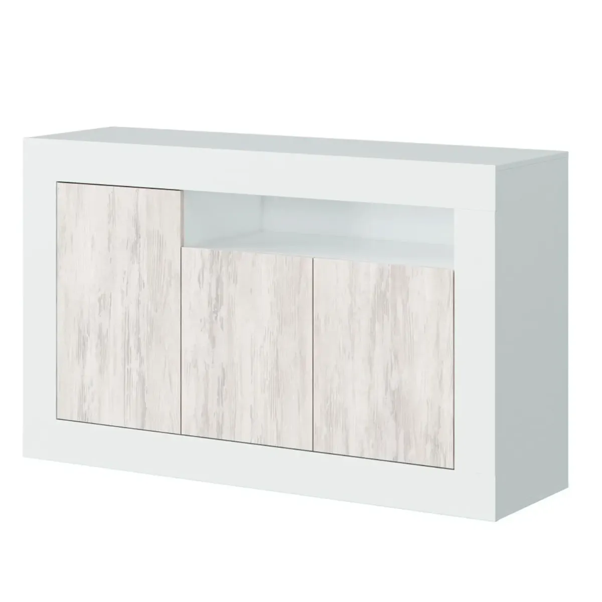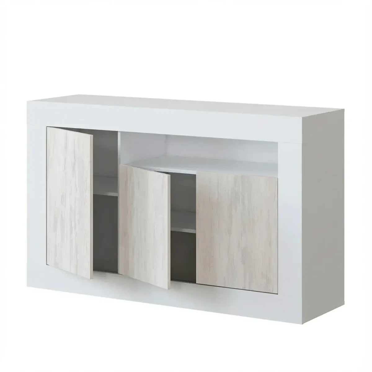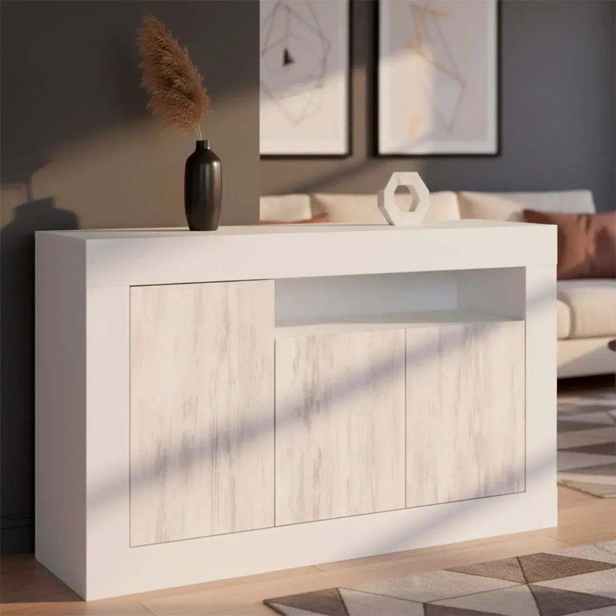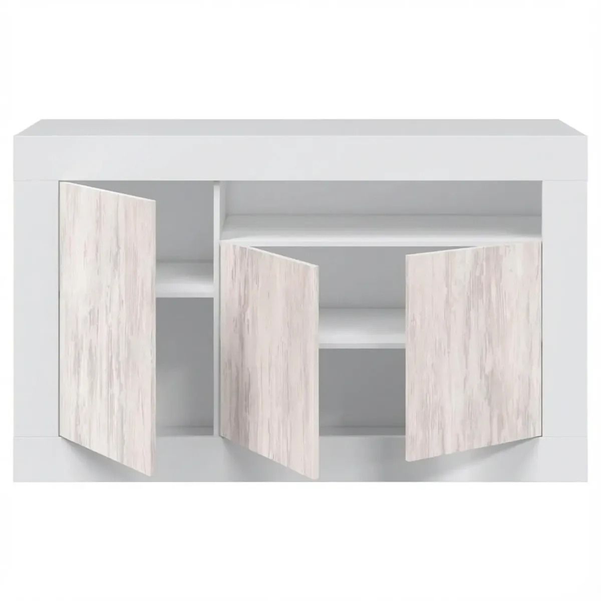 Credenza Moderna Madia A Terra Con 3 Ante Vano A Giorno E Ripiani Interni Mobile Contenitore In Melaminico Antigraffio Per Soggiorno Sala Da Pranzo 144 x 42 x 87 Cm-Bianco anticato e Bianco