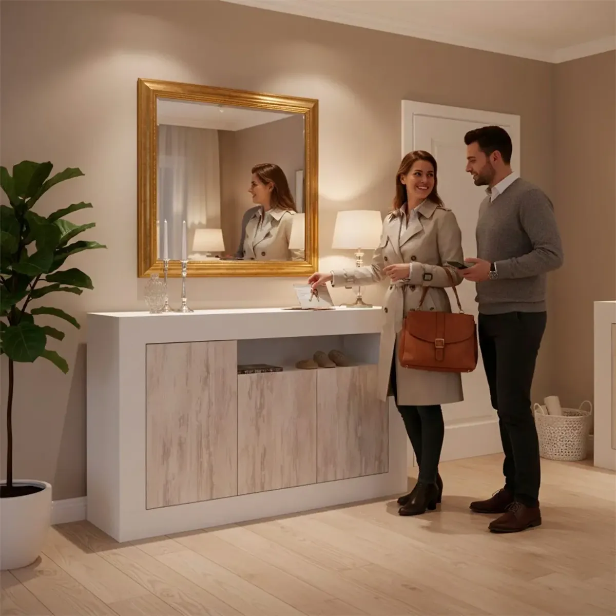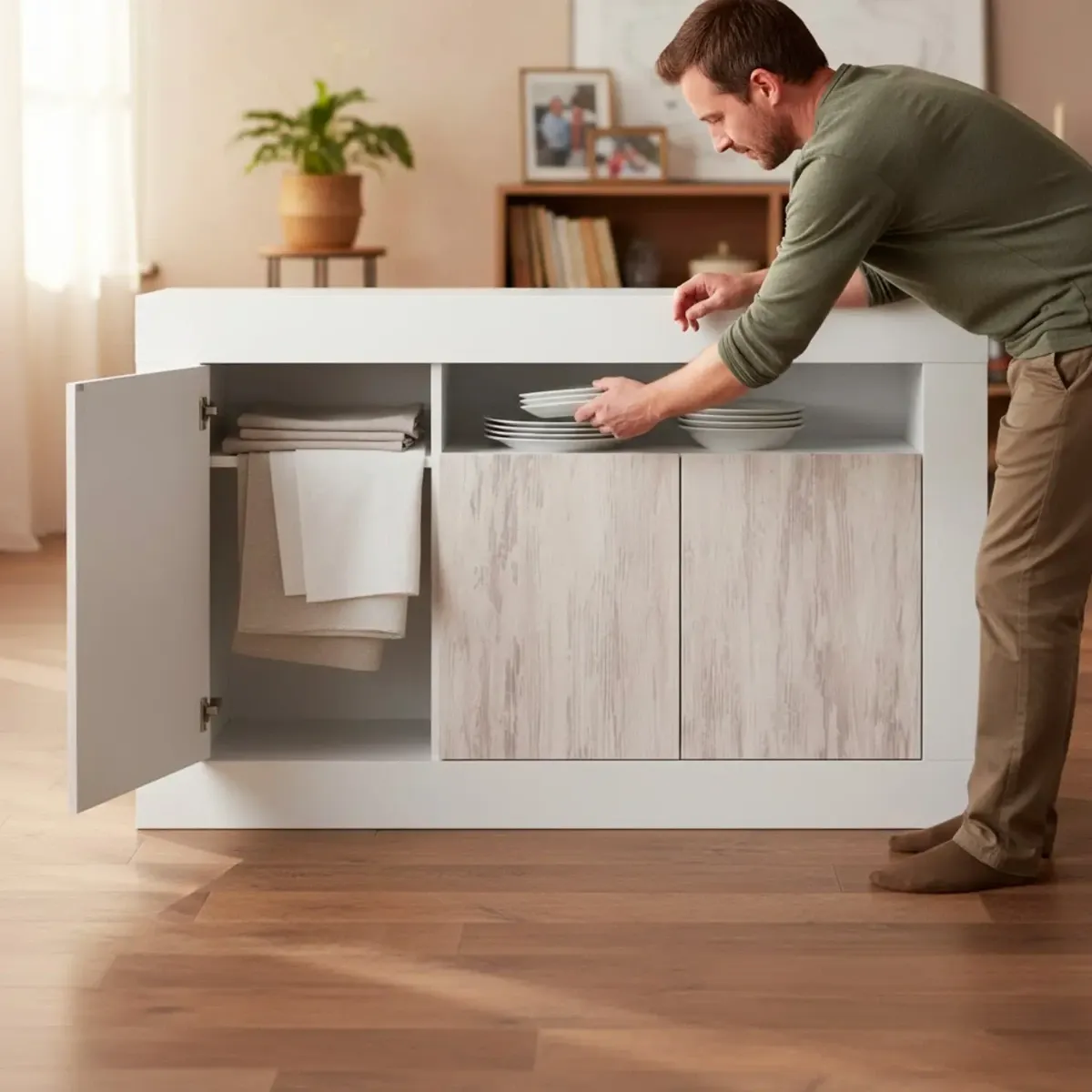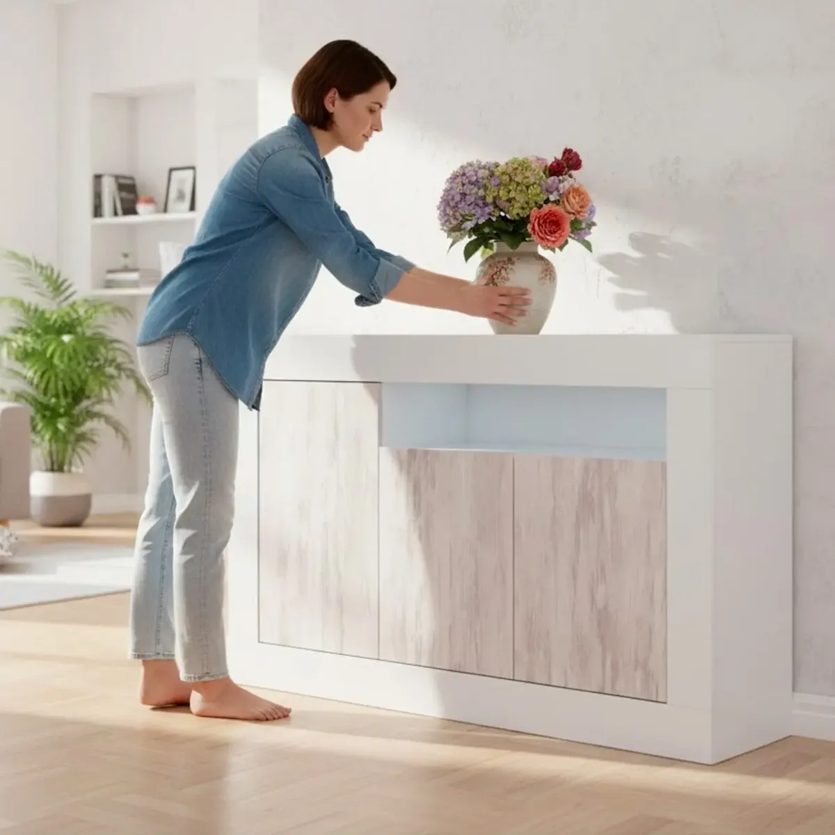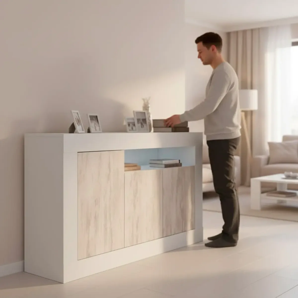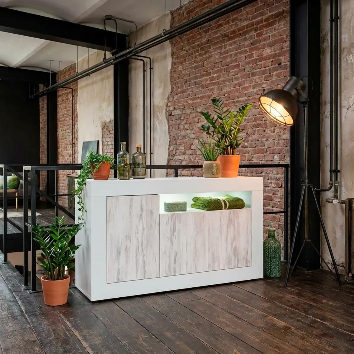 Credenza Moderna Madia A Terra Con 3 Ante Vano A Giorno E Ripiani Interni Mobile Contenitore In Melaminico Antigraffio Per Soggiorno Sala Da Pranzo 144 x 42 x 87 Cm-Bianco anticato e Bianco