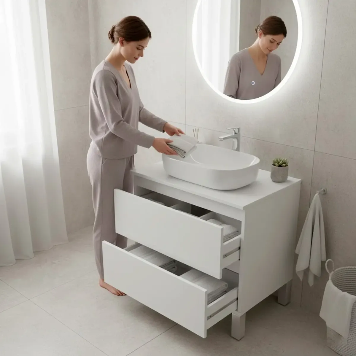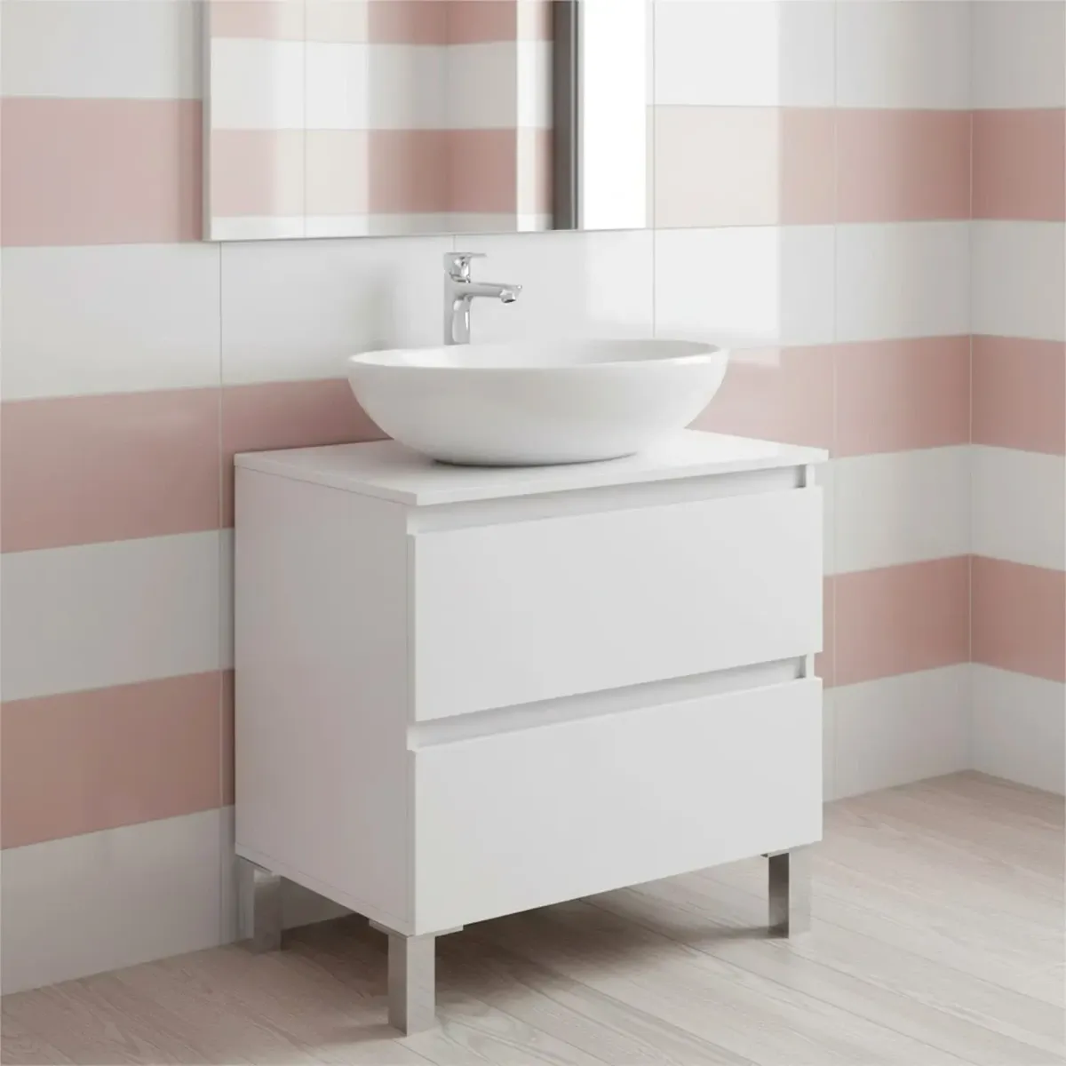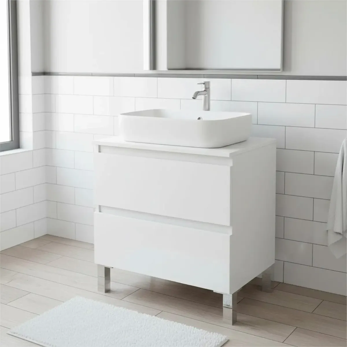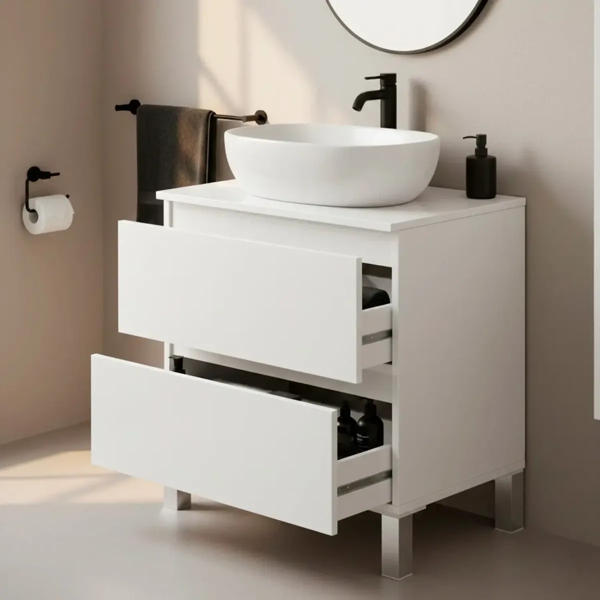 Mobile Bagno Sotto Lavabo Da Appoggio 2 Cassetti Salvaspazio Con Guide Metalliche E Gambe In Alluminio Design Moderno Minimal Ripostiglio Lavanderia 63.5 x 60 x 40 Cm
